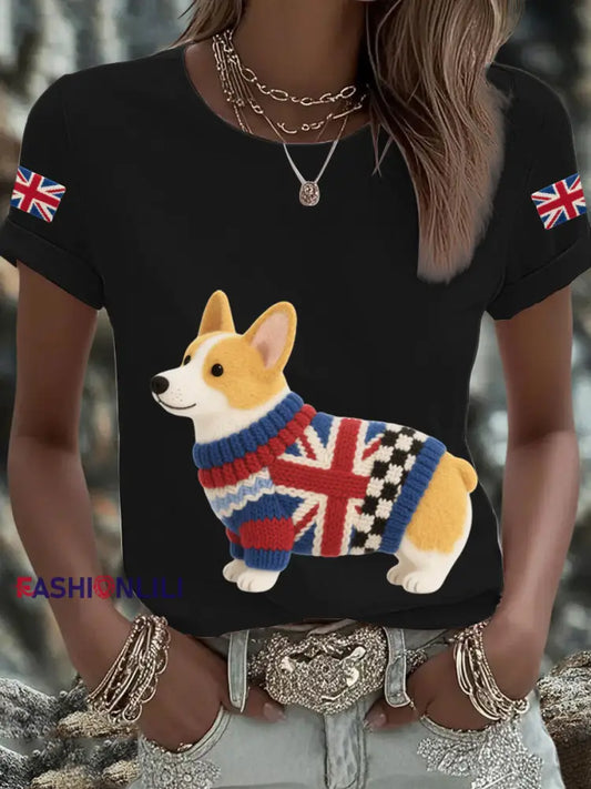 Women's UK Flag Corgi Printed T-shirt