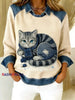 Retro Cute Cat Denim Scarf Patchwork Printed Casual Loose Long Sleeve Lapel Sweatshirt