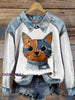 Women's Cowboy Collage Animal Printed Denim Patchwork Lapel Long Sleeved Sweatshirt