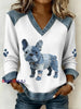 Women's French Bulldog Pattern Denim Patchwork Art V-Neck Top