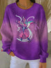 Women's Purple Gradient hummingbird Floral Print Ribbed Round-Neck Sweatshirt